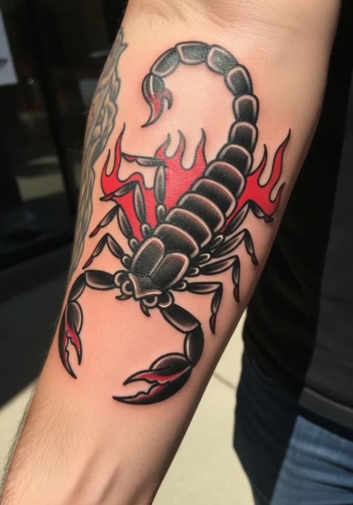 This forearm tattoo is pure fire literally. The bold black scorpion is surrounded by vibrant red flames that make it stand out instantly. The American Traditional shading gives it that classic vintage vibe, while the size and placement make it a perfect everyday statement piece.