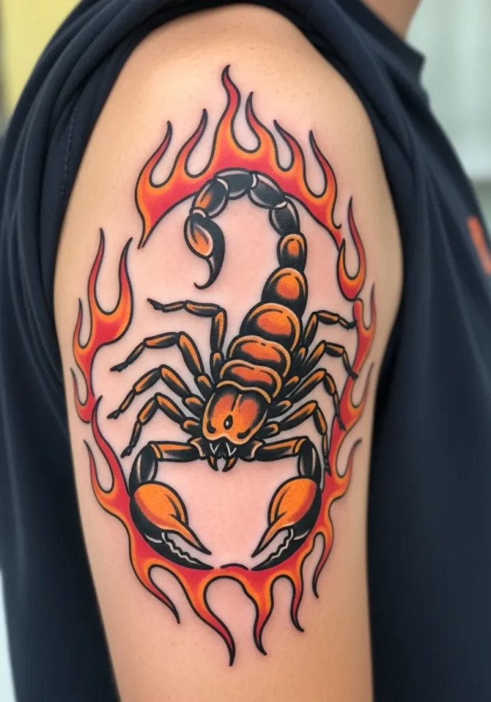 This energetic upper arm tattoo shows a bright orange scorpion surrounded by flickering red flames. The American Traditional style shines through with thick black outlines and bold color saturation. The flames encircle the scorpion perfectly, giving the design a fierce, dramatic look that flows naturally with the shoulder s curve.