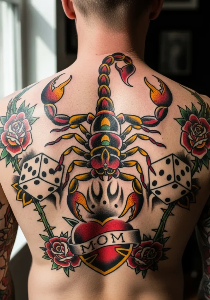 This large back tattoo features a fiery scorpion surrounded by classic old-school motifs like dice, roses, and a red heart with a banner. The black, yellow, and red tones work together beautifully, creating a design that feels alive and full of personality.