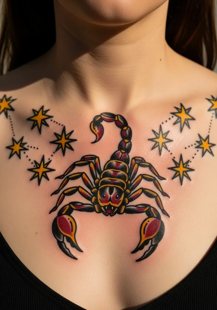 This large American Traditional tattoo spreads beautifully across the upper chest, featuring a bold scorpion surrounded by bright yellow stars arranged in a constellation pattern. The thick black outlines and warm red and gold accents make the piece pop against the skin. The placement allows the design to flow naturally with the collarbones, creating a perfect balance of symmetry and strength.