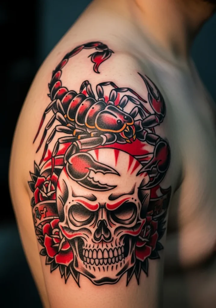 This tattoo combines two iconic American Traditional symbols a fierce scorpion and a bold skull on the shoulder. The design is full of deep black and red shading, surrounded by roses for that perfect old-school touch. The placement gives it a strong and structured look, flowing beautifully across the upper arm.