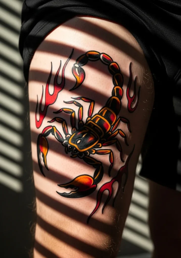 This thigh tattoo bursts with energy, showing a bright red and orange scorpion surrounded by flame-like details. The strong black shading keeps it rooted in the classic American Traditional style while the placement on the upper leg gives it plenty of room to shine. It s large, vibrant, and looks like it s ready to crawl right off the skin.