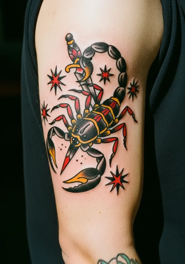 This large upper arm tattoo features a classic American Traditional scorpion surrounded by red stars and bursts of color. The bold black outlines paired with shades of red and yellow make the design pop, while the detailed claws and stinger show off traditional craftsmanship. The old-school stars add a cosmic touch that makes the whole piece feel almost celestial.