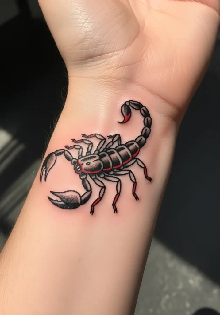 This small scorpion on the wrist uses bold outlines and soft black shading with a few red highlights for extra edge. The compact placement gives it a clean, minimal aesthetic while still holding that old-school traditional charm.