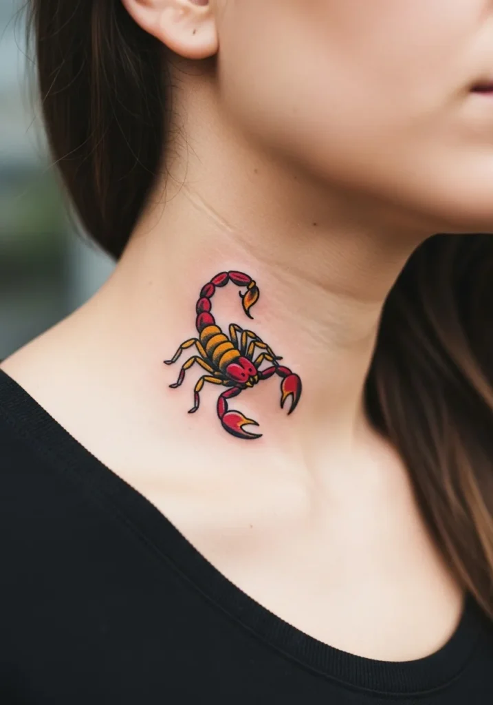 This small yet fiery American Traditional scorpion sits just above the collarbone, bringing a daring and confident touch to the neck area. The warm tones of red, orange, and yellow make it feel alive, while the precise black outlines keep it grounded in the traditional tattoo style.