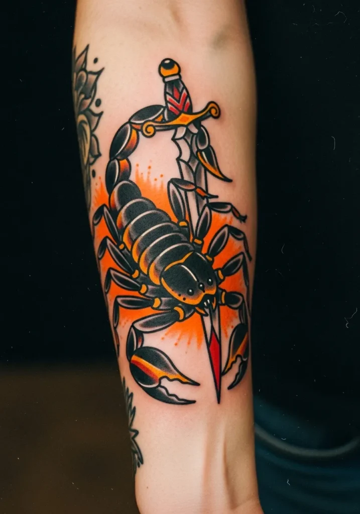 This forearm tattoo pairs a sleek, dark scorpion with a dagger piercing through its body, surrounded by bright orange highlights. The traditional style gives it that bold, timeless look, while the dagger adds an extra layer of symbolism strength through struggle.