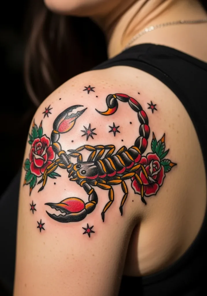 This tattoo rests beautifully across the shoulder, showing a large scorpion surrounded by tiny red stars and classic roses. The artist used bold black outlines and warm tones of yellow and red to make the design stand out against the skin. The flowers soften the overall look, giving the fierce creature a hint of beauty and balance.