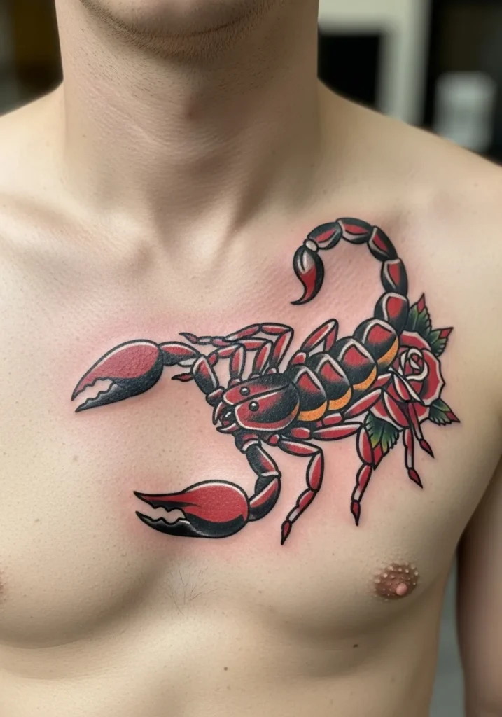 Placed over the chest, this large American Traditional scorpion tattoo bursts with rich red and orange tones and is accented by a classic rose at the base. The curved claws and detailed segments flow perfectly with the chest s shape, creating a design that feels both bold and well-balanced.