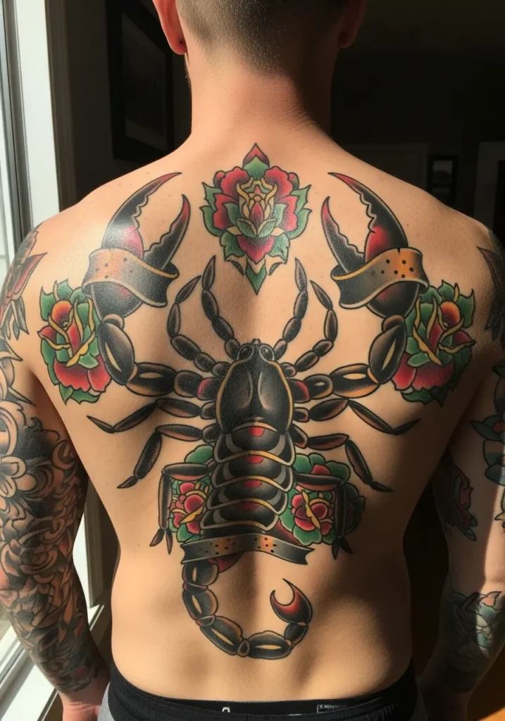 This breathtaking full-back tattoo showcases a massive American Traditional scorpion surrounded by vivid red and green roses. The artist used strong black shading, golden highlights, and symmetrical placement to create a truly commanding piece. Every curve of the tail and petal detail blends beautifully across the back s natural lines.