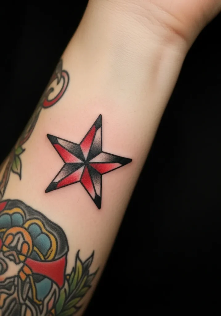 This tattoo features a small five-point star filled with red and black gradients. It s placed neatly on the forearm, surrounded by other colorful traditional pieces. The shading gives it depth, while the clean lines make it pop as a sharp geometric filler.