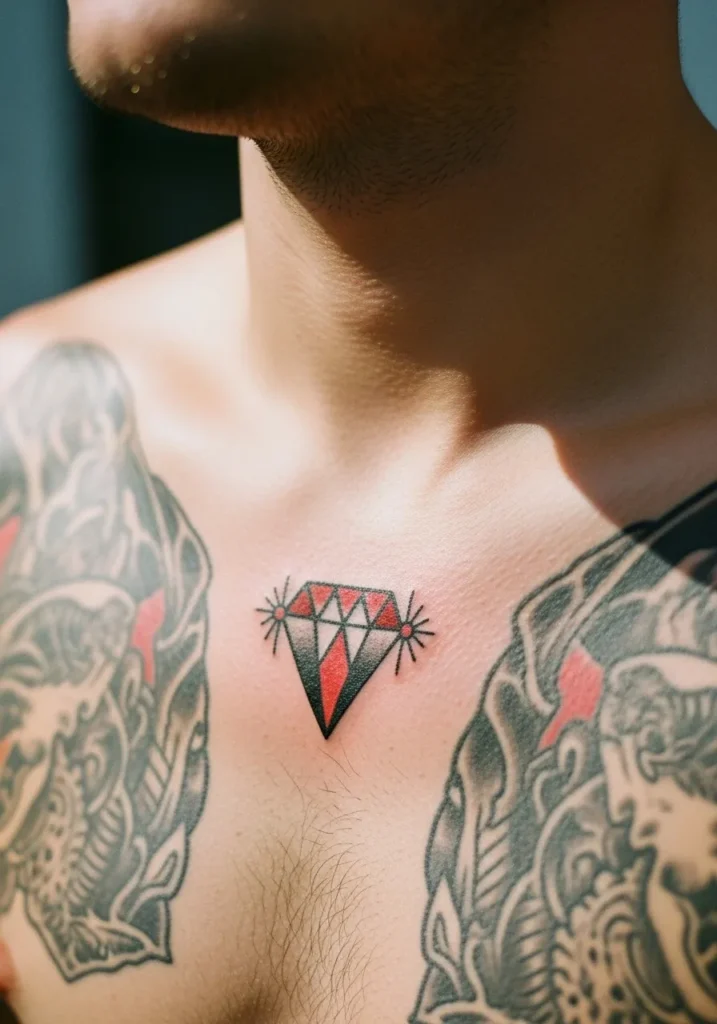 This small diamond tattoo sits perfectly at the center of the chest. It s shaded in red, black, and gray with clean geometric sections that sparkle even without color gradients. The symmetrical placement gives it a crisp, confident look that ties the whole chest piece together.