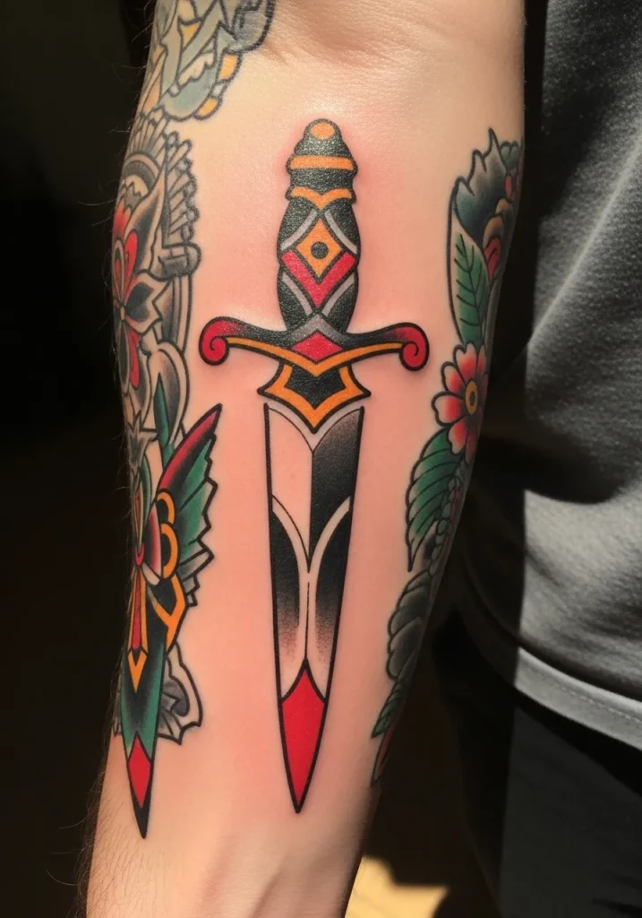 This sleek dagger tattoo stretches along the forearm, with a red-tipped blade and golden details near the hilt. The shading is smooth and bold, framed by thick black outlines that define the shape perfectly. It fits seamlessly among other classic tattoos.