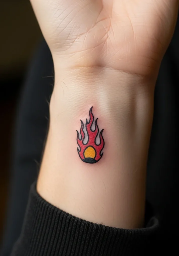 This tiny flame tattoo sits neatly on the wrist, done in vibrant shades of red, orange, and yellow. The classic bold outline keeps it rooted in the American traditional style while the size makes it a perfect small filler or standalone piece.