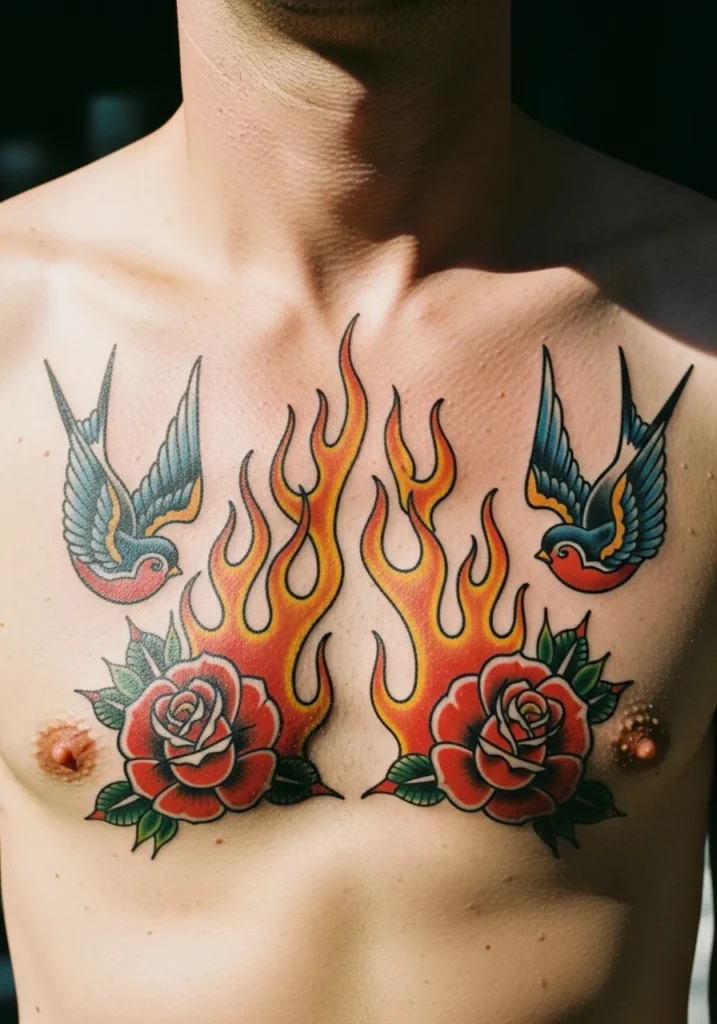 This chest tattoo features two bold red roses surrounded by vibrant yellow and orange flames, with blue and red swallows flying above them. The symmetry is stunning, stretching across the chest in true American traditional style. The crisp outlines and high-contrast colors make it a statement piece that demands attention.