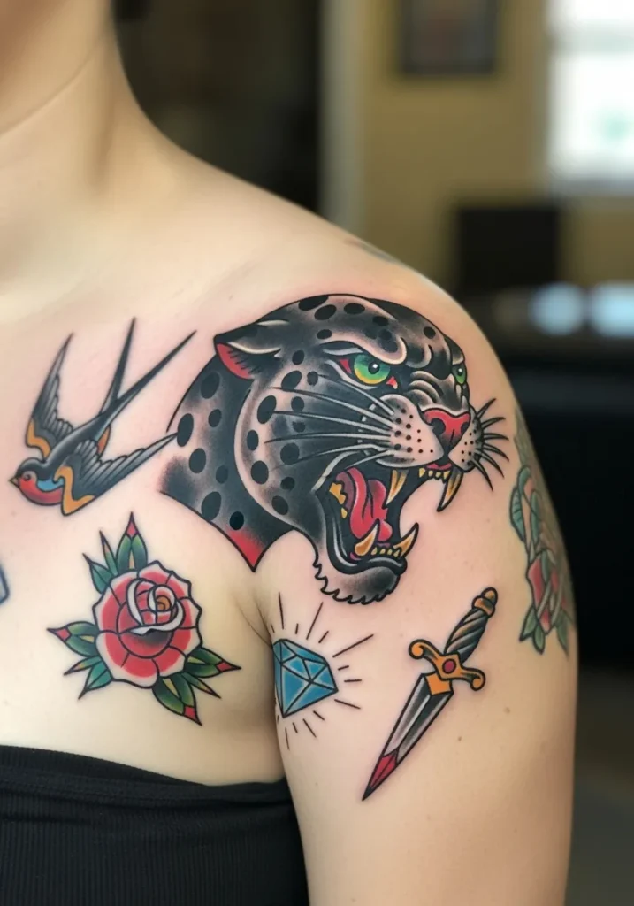 This shoulder tattoo features a black panther head mid-snarl, surrounded by roses, daggers, and a bright blue diamond. The details are sharp, with strong outlines and saturated colors that pop against the skin. It sits perfectly across the shoulder blade, tying all the elements together.