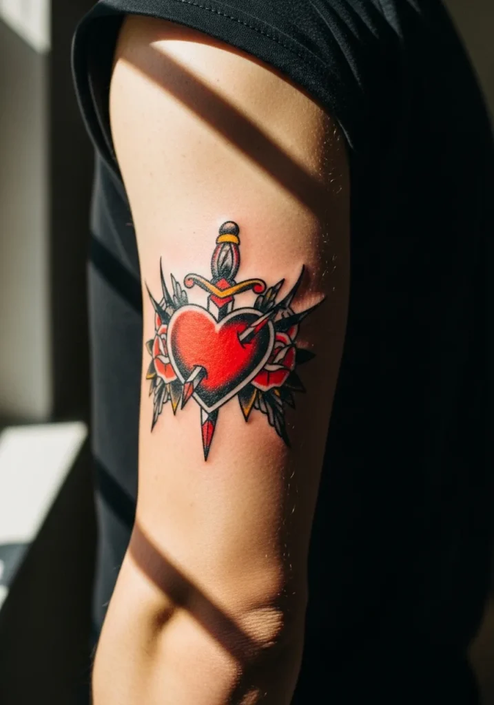 This upper-arm tattoo shows a flaming red heart pierced by a dagger, surrounded by sharp black and yellow details. The bold outlines and rich shading give it that unmistakable American traditional punch. It s perfectly centered, and the light reflecting off the skin makes the red look extra vibrant.