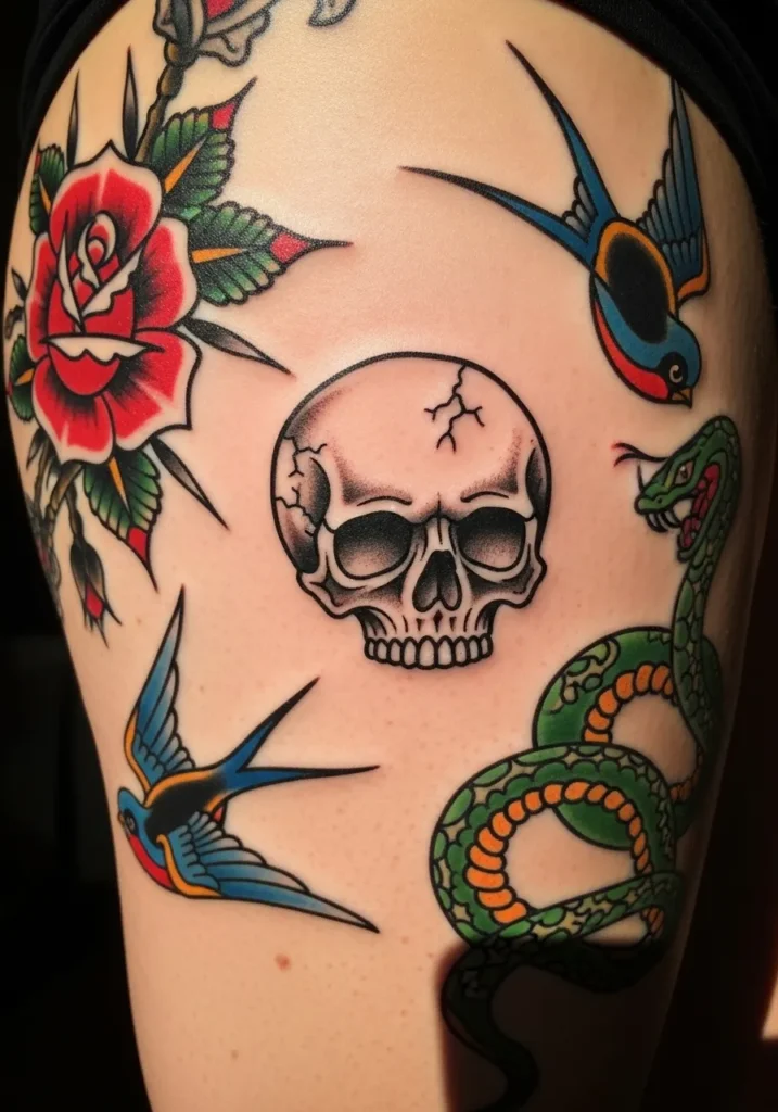 This thigh tattoo brings together a cracked skull, two blue swallows, a coiled green snake, and bright red roses all in crisp American traditional style. Each element is bold and saturated, filling the space beautifully while leaving just enough skin to breathe.