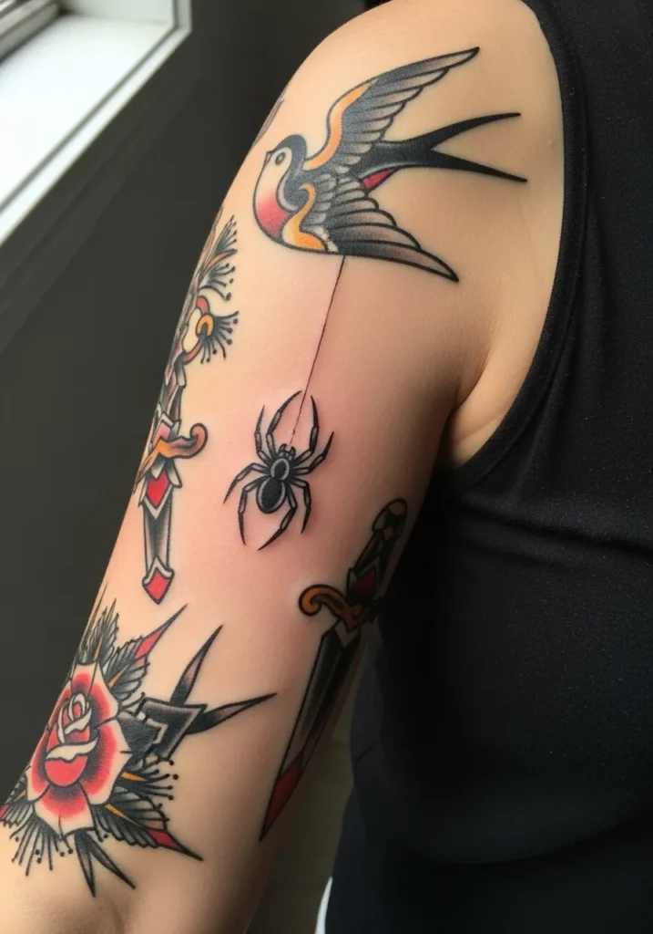 This upper-arm tattoo shows a black spider hanging from a fine line of web, positioned among daggers, roses, and a swallow. The clean lines and precise placement make it feel perfectly integrated into the sleeve.