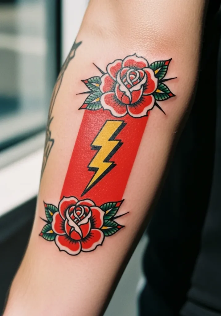 This forearm tattoo features a yellow lightning bolt over a bold red background, framed by two large red roses. The contrast between the bright bolt and the solid block of color gives it a striking graphic feel, while the roses soften the edges just enough.