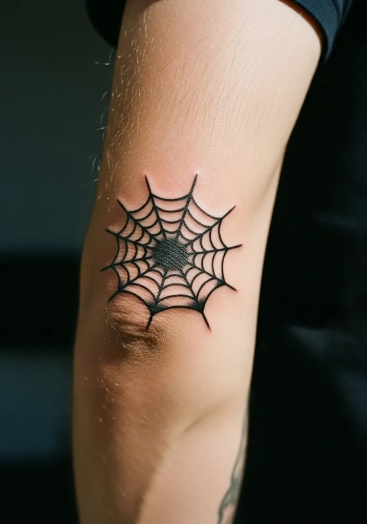 Positioned right over the elbow, this black spider web tattoo is a classic filler that never fails to make a sleeve feel cohesive. The lines are clean and symmetrical, stretching perfectly around the joint. The simplicity works beautifully with the surrounding bold designs.