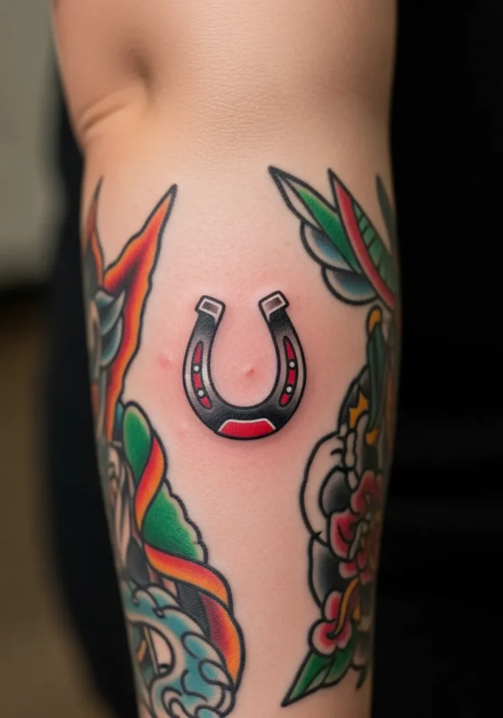 Placed near the elbow, this compact horseshoe tattoo stands out with its black and red color scheme. The simple shape is outlined cleanly and fits perfectly between larger surrounding designs. Its symmetry makes it a satisfying filler that ties other tattoos together seamlessly.