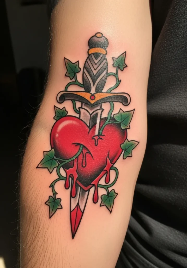 This dramatic design on the back of the arm shows a dagger piercing through a red heart wrapped in green ivy leaves. The colors are intense rich reds, deep greens, and metallic gray all bordered with thick black outlines for that perfect traditional punch.