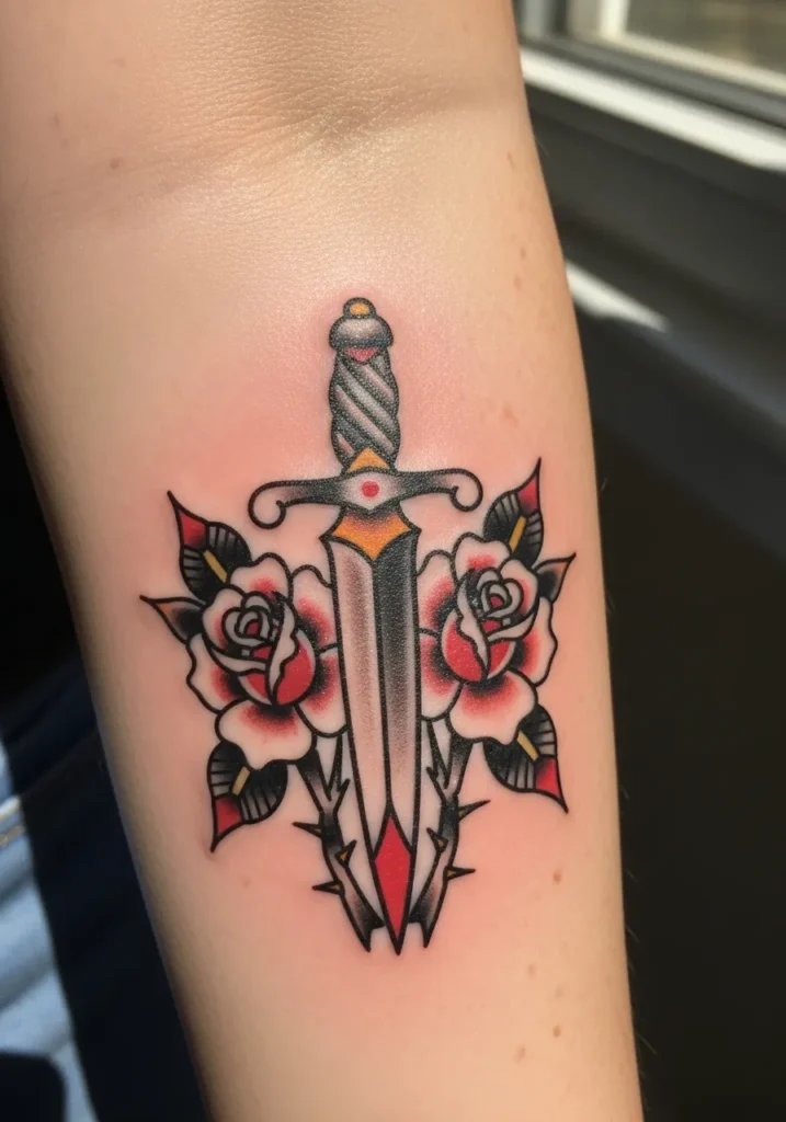 This tattoo shows a dagger placed vertically between two red and white roses. The blade is shaded in silver tones with deep red accents, while the roses add softness around it. The composition is tidy, sitting beautifully on the inner forearm.