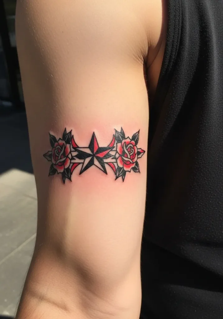 This armband tattoo wraps around the upper arm with a black and red nautical star centered between two blooming red roses. The symmetry gives it a balanced, polished look, while the color palette keeps it bold and unmistakably traditional.
