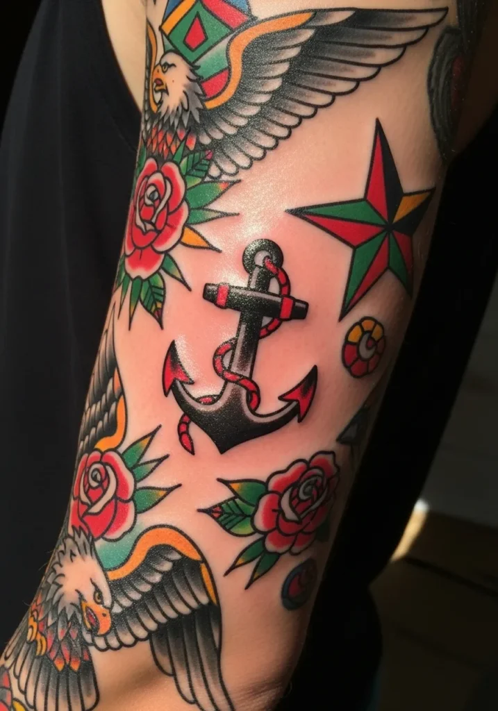 This forearm tattoo features a black anchor wrapped in red rope, surrounded by roses, eagles, and colorful stars. The design blends perfectly into a larger sleeve, using vibrant reds, greens, and yellows for that unmistakable old-school look. The shading is crisp and clean, giving it a polished yet bold feel.