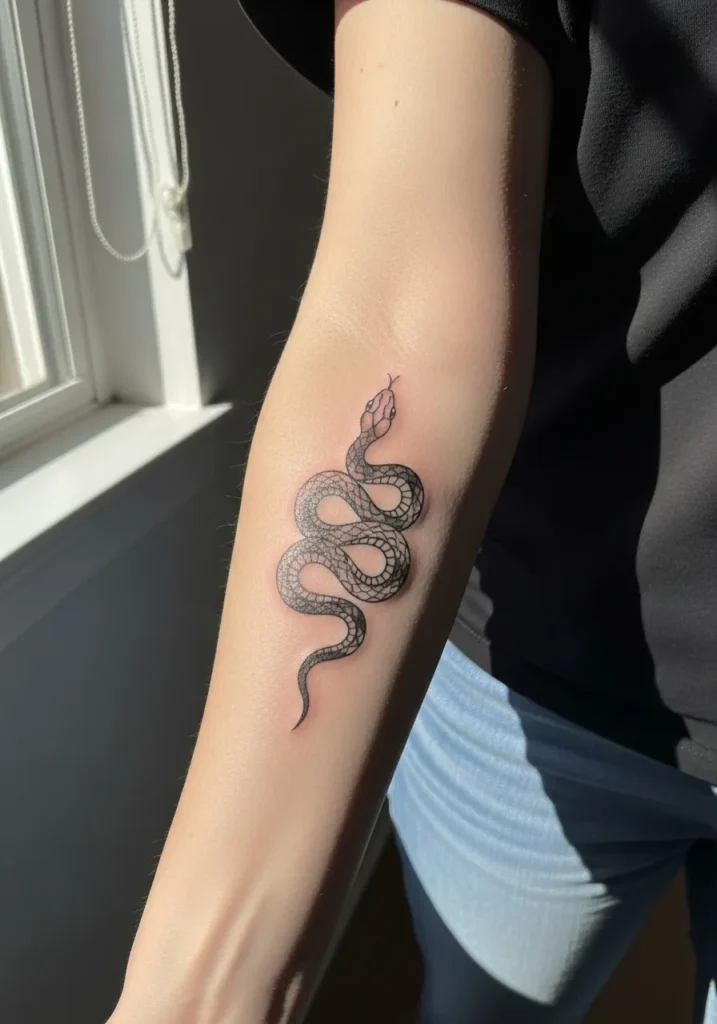 This sleek snake tattoo curves elegantly along the forearm, shaded in soft blacks and grays. The body twists naturally, with delicate linework showing off each scale in fine detail. It s small enough to fill space perfectly without overpowering nearby designs.