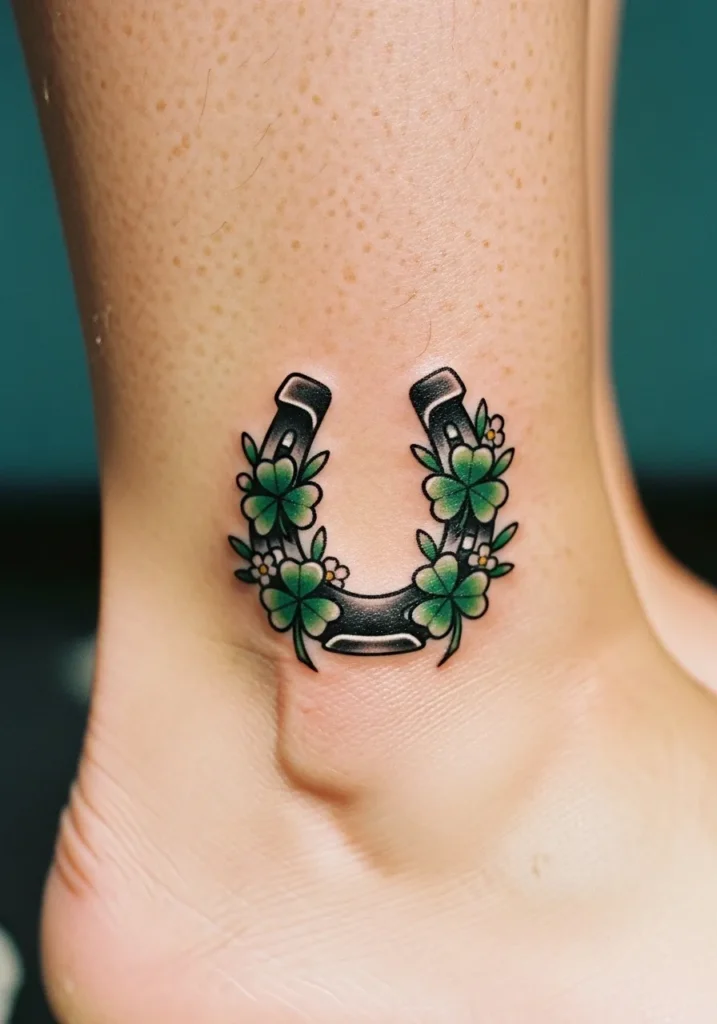 Placed just above the ankle, this tattoo shows a black horseshoe adorned with green clovers and tiny white flowers. The design is compact and cheerful, glowing softly against the skin with smooth shading and clean outlines.