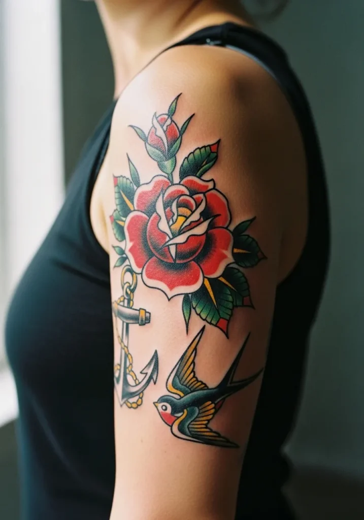 This upper-arm tattoo shows off a bold red rose paired with a solid gray anchor and a flying swallow. It s done in true American traditional style, with thick black outlines, deep green leaves, and hints of gold and orange for warmth. The piece feels balanced and timeless, especially with the anchor s rope adding a lovely vintage touch.