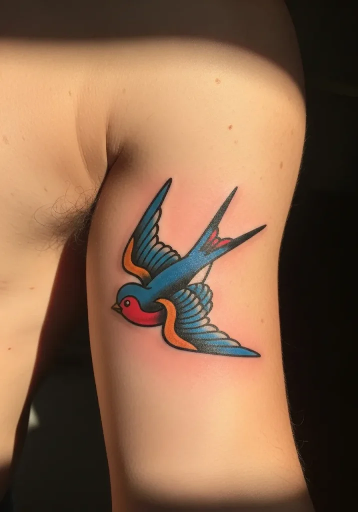 This small to medium swallow tattoo sits on the upper arm, its wings open wide in flight. The colors are stunning deep blue, fiery orange, and a hint of red all outlined in crisp black ink. The sunlight in the photo highlights the subtle redness of freshly inked skin, giving it a fresh, authentic look.