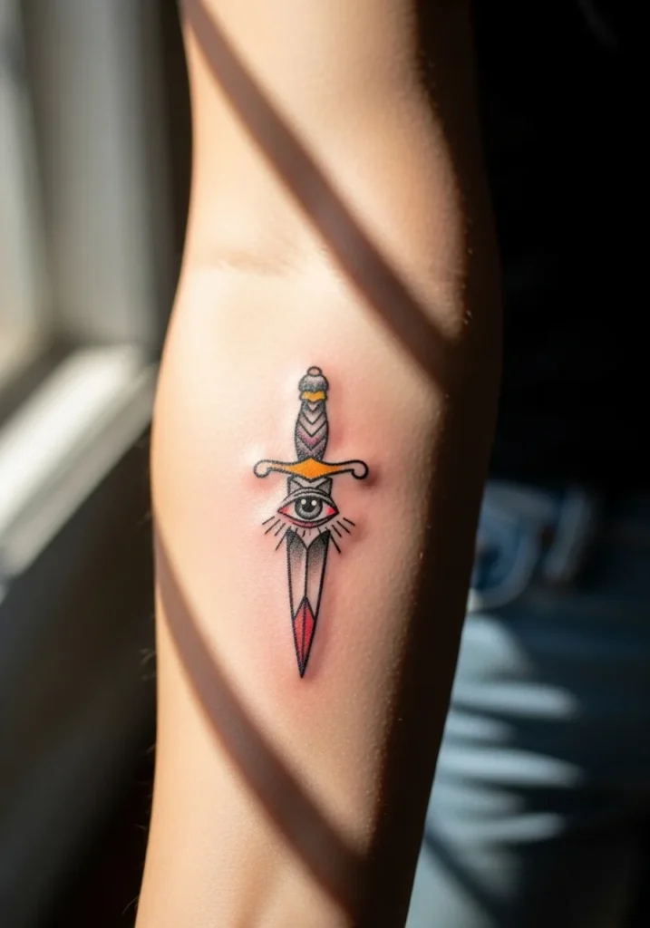 Placed neatly on the forearm, this small dagger tattoo features an eye at its center, surrounded by subtle rays of light. The red and black shading gives it depth, while the gold details add a touch of warmth. It s minimal yet full of personality.
