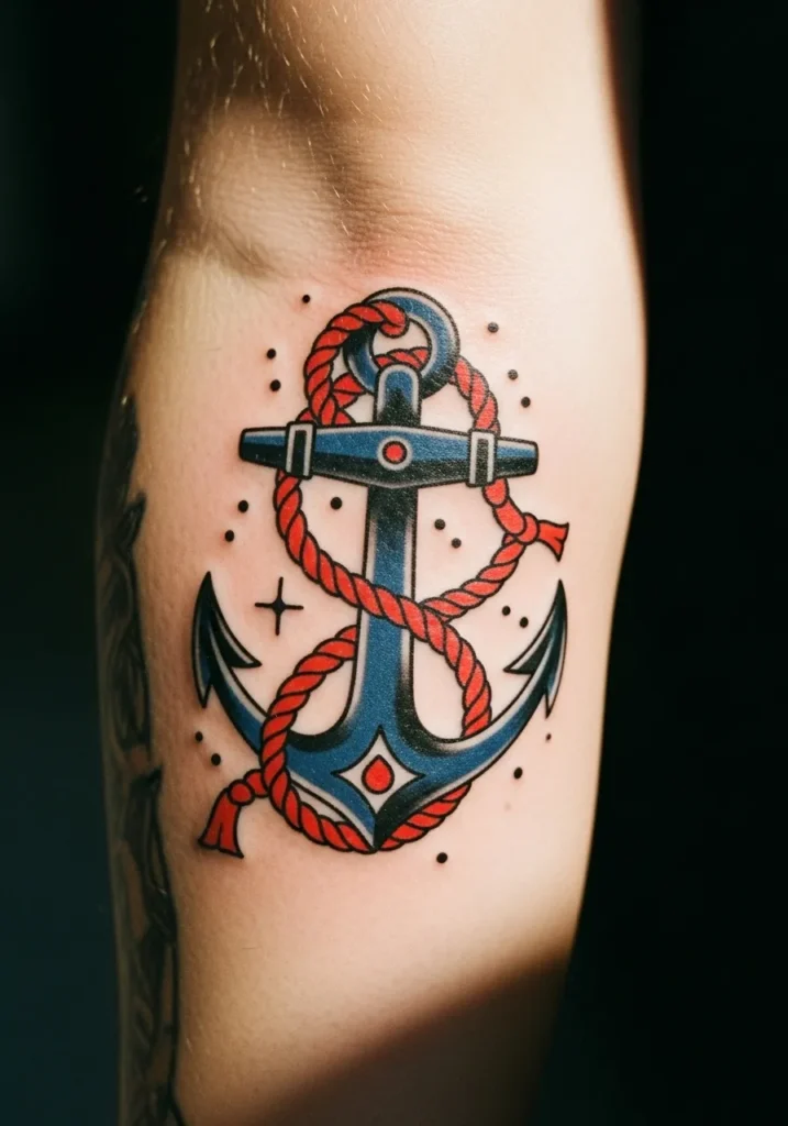 This tattoo sits perfectly on the forearm, showcasing a deep blue anchor wrapped with a bright red rope. Tiny dot accents surround the anchor, giving it a little sparkle and dimension. The shading is beautifully smooth, and the contrast between the blue and red makes it pop.