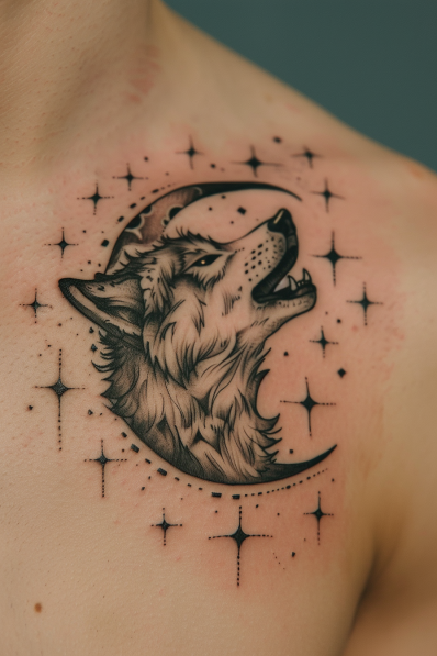 What s great about this tattoo is its mix of power and serenity. The wolf represents independence and loyalty, while the moon and stars add a sense of mystery and calm. It s perfect for someone who feels connected to the wild or drawn to the night sky. The balance between the fierce wolf and the tranquil moon makes this design both bold and deeply meaningful. A real head-turner!