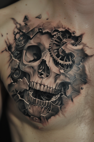I can t get over how cool this tattoo is it s like a piece of sci-fi art brought to life. The detail in the gears and the realistic cracks in the skull show incredible craftsmanship. It s the perfect design for someone who sees themselves as a mix of raw humanity and machine-like precision. If you want a tattoo that stands out and sparks conversations, this one s a total masterpiece.