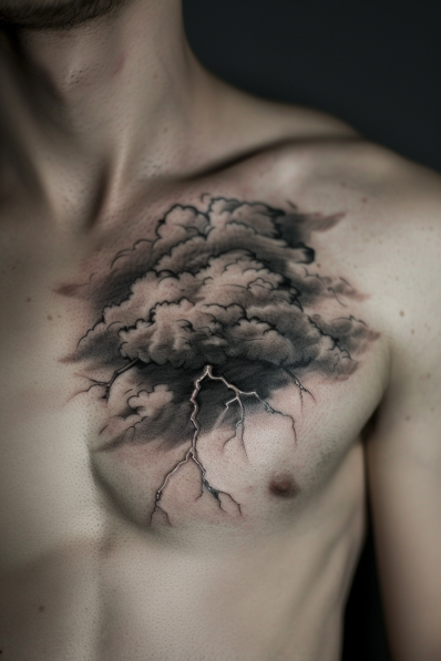 This tattoo is pure energy, capturing the raw power of a brewing storm. The storm cloud is packed with depth, its swirling, ominous layers brought to life with expert shading that gives it a realistic, almost 3D effect. Lightning bolts crackle downward, adding a striking and dynamic element to the design. The contrast between the dark clouds and the bright lightning makes this piece feel alive, like you can almost hear the rumble of thunder.