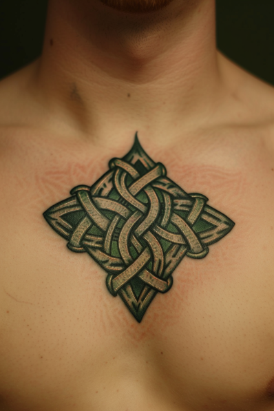 This tattoo is a mesmerizing piece of Celtic-inspired art, featuring an intricate knotwork design woven into a diamond-shaped pattern. The bold green and black tones create a rich contrast, giving the tattoo a sense of depth and timeless beauty. Each strand intertwines seamlessly, symbolizing unity, eternity, and strength. The symmetry and precision in this piece make it a stunning and meaningful choice.
