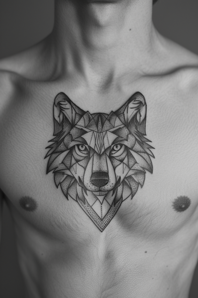 This tattoo is a stunning fusion of modern art and raw wilderness. The wolf s face is crafted with clean geometric lines and sharp angles, creating a mesmerizing pattern that s both symmetrical and bold. The detailed dot work shading adds depth and texture, giving the piece a dynamic, multidimensional feel. It s a perfect balance of artistry and power, capturing the wolf s spirit in a fresh, contemporary style.