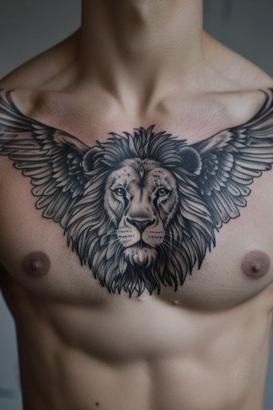This tattoo is a masterpiece of power and grace. A lion stares with piercing intensity, its mane flowing into detailed wings that fan outward. The wings are shaded beautifully, adding depth and texture, while the lion s face radiates strength and majesty. The overall design strikes a perfect balance between boldness and elegance, making it a standout piece that symbolizes courage and freedom.