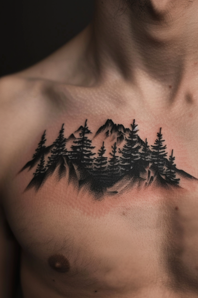 This tattoo captures the serene beauty of nature with a dark, minimalist silhouette of towering pine trees against rugged mountain peaks. The black ink shading creates a moody yet calming atmosphere, evoking the peace and majesty of the wilderness. The clean, crisp lines of the trees blend seamlessly into the soft, gradient shading of the mountains, making the entire piece feel balanced and harmonious.