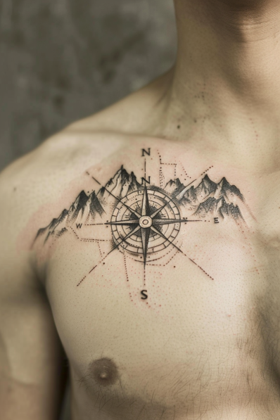 I can t get over how cool this tattoo is it s like a personal roadmap for adventure. The compass brings that find your way vibe, and the mountains are a constant reminder to aim high and stay grounded. It s artistic without being overly complicated, and the clean design makes it easy to appreciate. If you re all about chasing new horizons, this is the ink to match your soul.
