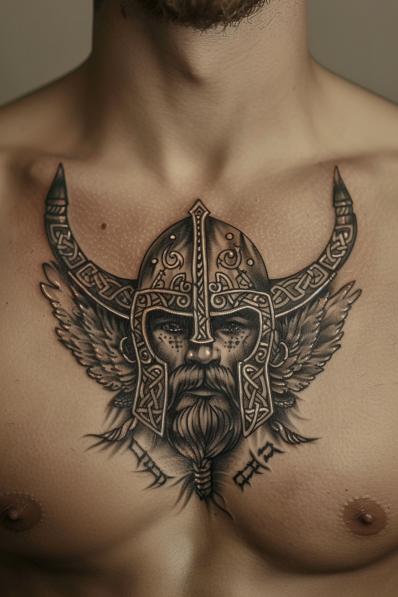 This tattoo is the ultimate tribute to Norse mythology and warrior culture. At its center is a fearsome Viking warrior adorned with an intricately detailed helmet featuring knotwork patterns and powerful horns. His intense gaze, framed by a rugged beard, exudes strength and determination. The wings emerging from the sides of the helmet add a dynamic and almost divine feel, while the runes beneath give it an authentic touch that nods to ancient Viking heritage.