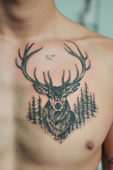 This tattoo features a striking stag with antlers stretching proudly upward, giving the design a commanding presence. The detailed forest scene beneath the stag adds an earthy and tranquil vibe, with tall evergreens and tiny birds in the sky completing the wilderness aesthetic. The balance of bold lines in the stag and soft shading in the trees gives this tattoo a dynamic yet harmonious look.