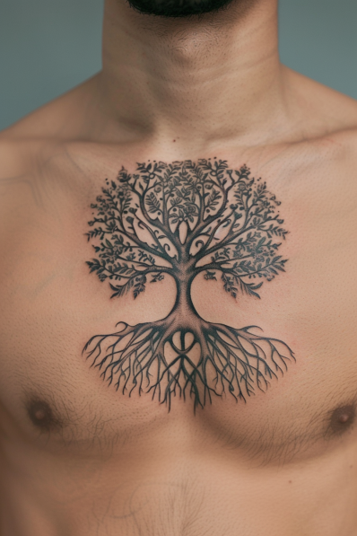 This tattoo is a timeless symbol of growth and connection, featuring a beautifully detailed tree with sprawling branches and deep, intricate roots. The branches are lush and full, representing life and new beginnings, while the roots anchor the design with strength and stability. The symmetry between the top and bottom creates a harmonious balance, making it visually captivating and deeply meaningful.