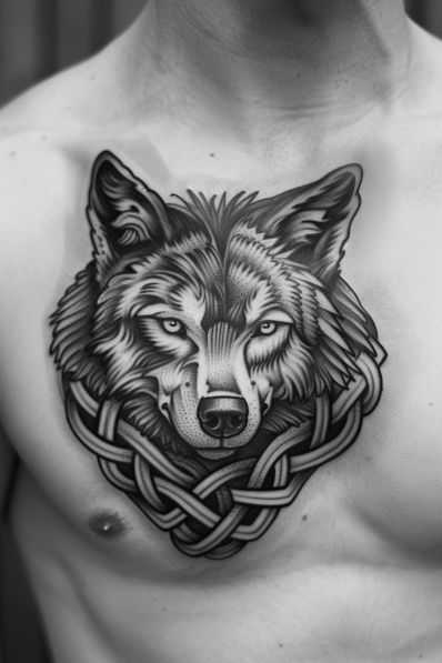 This striking tattoo showcases the fierce and majestic head of a wolf, combined with an intricate Celtic knot that wraps around its lower face and neck. The engraving-style linework adds dimension and texture to the wolf s fur, capturing its intense gaze and sharp features. The Celtic knot adds an additional layer of symbolism, representing unity, eternity, and interconnectedness. The shading work gives the design depth, making the wolf appear almost lifelike.