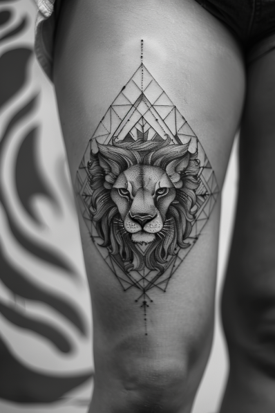 This fierce design showcases a lion s face surrounded by intricate geometric patterns, blending the natural power of the lion with precise, structured shapes. The engraving-style linework creates depth and texture in the lion s mane, making it appear almost lifelike. The geometric elements, including sharp triangles and diamonds, frame the lion s head perfectly, giving the tattoo a modern and edgy vibe. The contrast between the organic flow of the mane and the sharp geometry adds a dynamic energy to the piece.