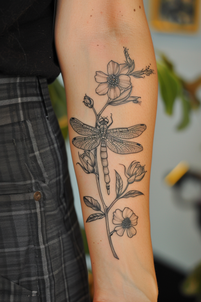 What I really love about this tattoo is how it mixes the fragility of the dragonfly with the timeless beauty of flowers, creating a serene and calming vibe. The engraving style gives it that vintage feel, like something you d see in an old botanical illustration. It s not overly bold, but it still makes a statement with its fine details and natural elegance. This tattoo is perfect for anyone who appreciates the subtle beauty of nature, and let s be honest there s something undeniably peaceful about wearing a dragonfly and flowers as a reminder of life s little moments of calm.