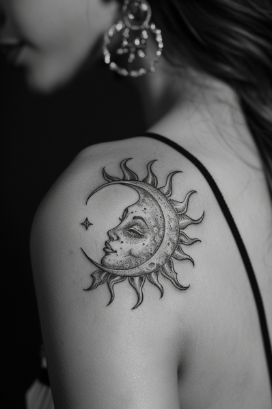 This beautifully balanced tattoo features a celestial scene with the sun and moon intricately entwined, rendered in a classic engraving style. The sun s radiant flames swirl around a calm, serene moon face, creating a perfect harmony between light and dark. The dotted shading gives the moon s face a soft, ethereal texture, while the sun s rays bring a dynamic contrast to the design. A small star floats nearby, adding an extra touch of cosmic charm. The shoulder placement is ideal for showcasing this harmonious blend of opposites.